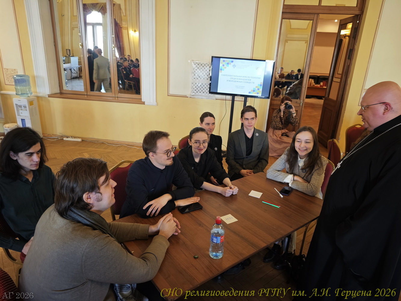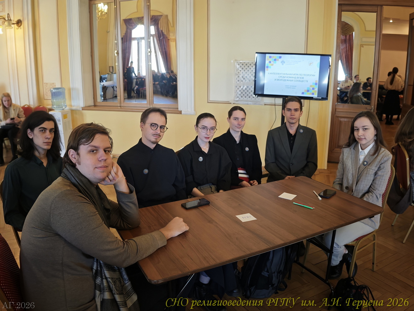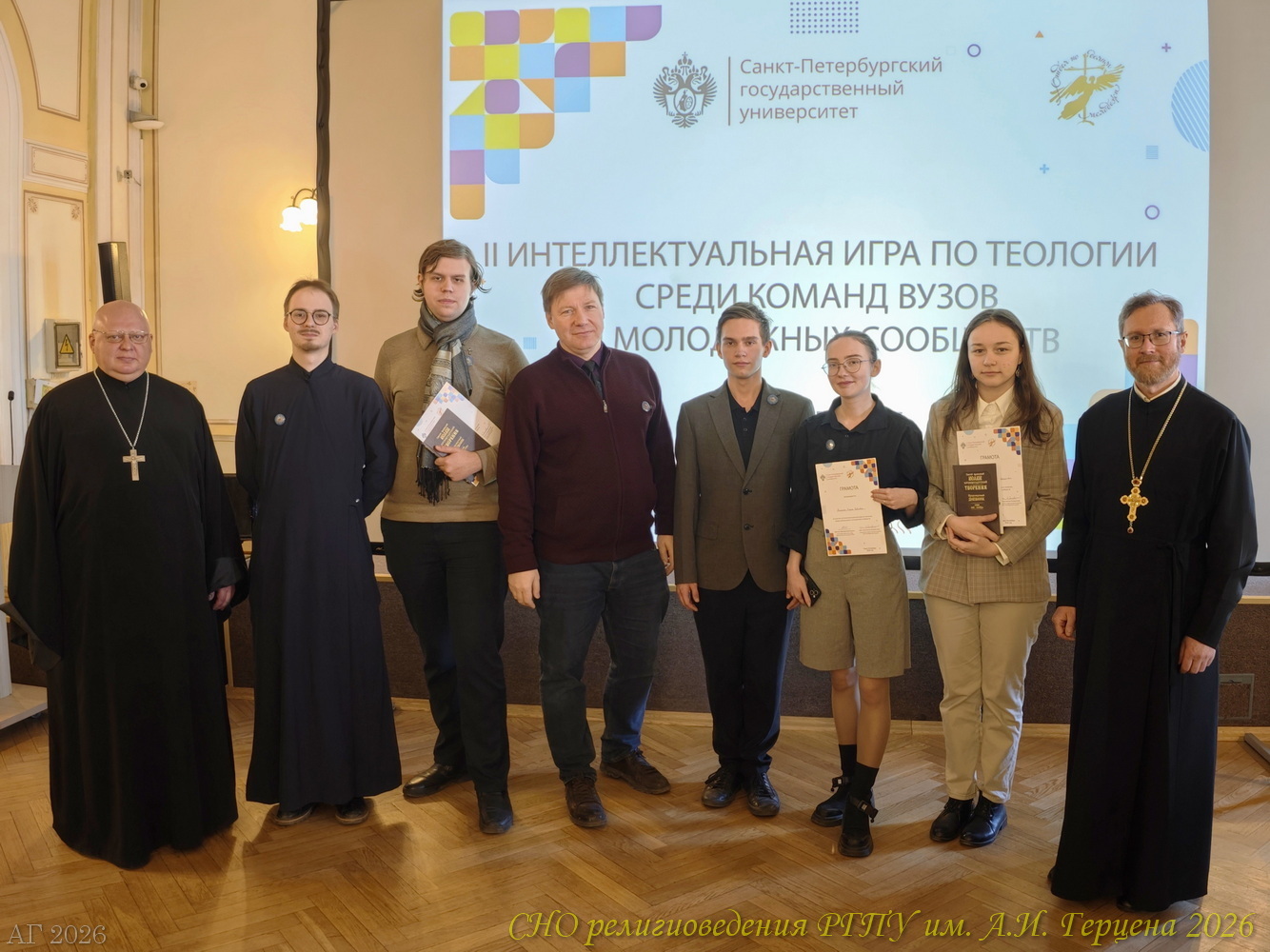 14 марта 2026 года команда студентов ИИСН РГПУ им. А.И. Герцена в Санкт-Петербургском государственном университете приняла участие в интеллектуальной игре «Что? Где? Когда?» для знатоков теологии. Второй год подряд интеллектуальная игра по теологии среди команд вузов и молодёжных сообществ проводится при поддержке Института теологии СПбГУ и Отдела по делам молодёжи Санкт-Петербургской епархии Русской Православной Церкви. В этот раз, в игре участвовало десять команд: кроме герценовцев были студенты Санкт-Петербургской духовной академии, Института теологии СПбГУ, РХГА им. Ф. М. Достоевского, православные молодёжные объединения Казанского собора, Исаакиевского собора, «Керигма», военного отдела Санкт-Петербургской епархии. В этот раз к игре подключились и студенты Новгородского университета имени Ярослава Мудрого.