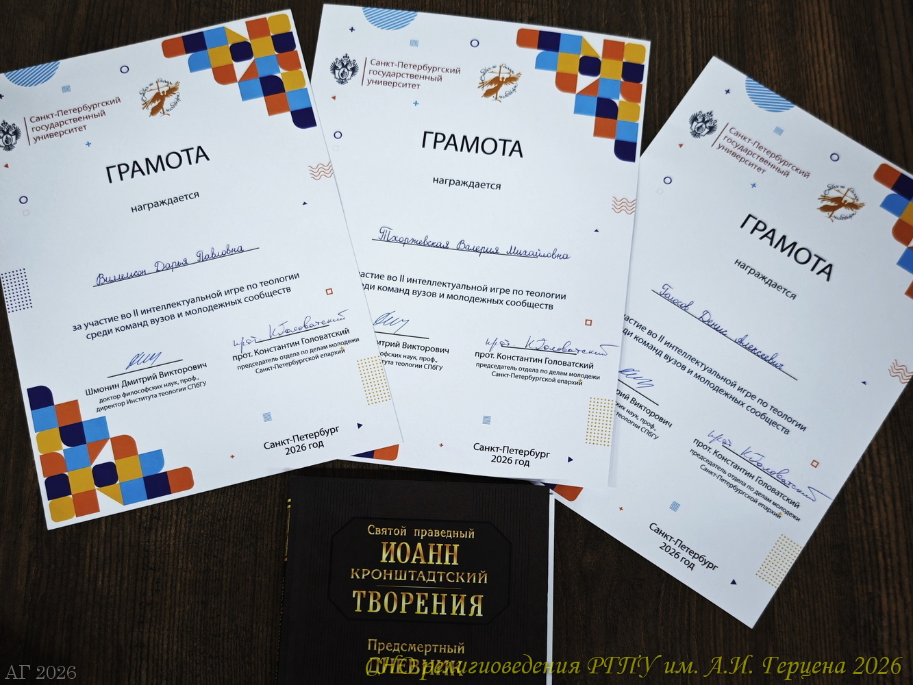 Перед началом игры о. Дмитрий Симонов поддержал напутствием команду герценовцев. Позитивному настрою способствовала прекрасная музыка квартета СПбГУ и чай с печеньем в перерыве между раундами. Все участники получили по книге «Предсмертный дневник» святого праведного Иоанна Кронштадтского, предоставленной Благотворительным фондом «Иоанновская семья». А занявшие первые места команды СПбДА, ИТ СПбГУ и «Встреча будущего» Казанского собора – памятные подарки.