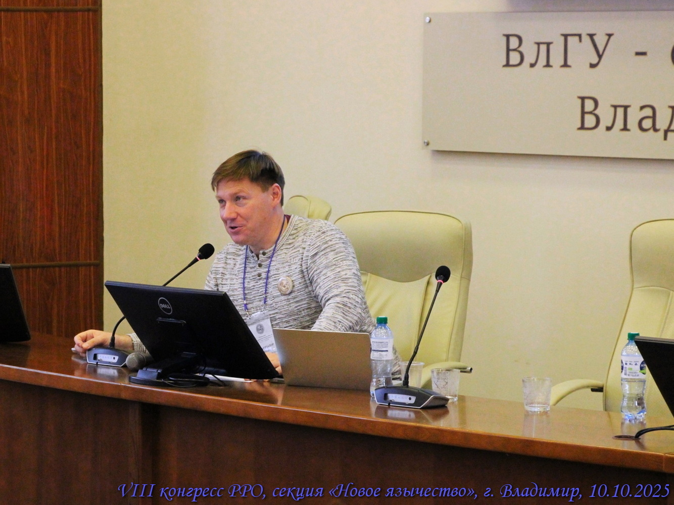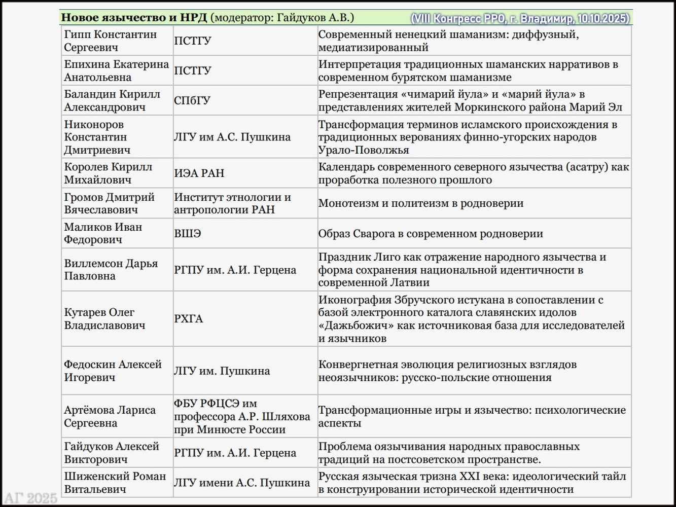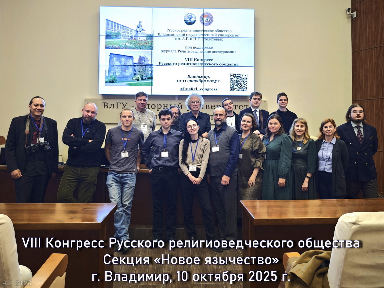 Участники Секции «Новое язычество» VIII конгресс Русского религиоведческого общества, Владимир, 10.10.2025Секция «Новое язычество» VIII конгресс Русского религиоведческого общества, Владимир, 10.10.2025Гипп К.С. «Современный ненецкий шаманизм: диффузный, медиатизированный». VIII конгресс РРО, 10.10.2025Епихина Е.А. «Интерпретация традиционных шаманских нарративов в современном бурятском шаманизме». VIII конгресс РРО, 10.10.2025Баландин К.А. «Репрезентация “чимарий йула” и “марий йула” в представлениях жителей Моркинского района Марий Эл». VIII конгресс РРО, 10.10.2025Никоноров К.Д. «Трансформация терминов исламского происхождения в традиционных верованиях финно-угорских народов Урало-Поволжья». VIII конгресс РРО, 10.10.2025Громов Д.В. «Монотеизм и политеизм в родноверии». VIII конгресс РРО, 10.10.2025Маликов И.Ф. «Образ Сварога в современном родноверии». VIII конгресс РРО, 10.10.2025Виллемсон Д.П. «Праздник Лиго как отражение народного язычества и форма сохранения национальной идентичности в современной Латвии». VIII конгресс РРО, 10.10.2025Кутарев О.В. «Иконография Збручского истукана в сопоставлении с базой электронного каталога славянских идолов «Дажьбожич» как источниковая база для исследователей и язычников». VIII конгресс РРО, 10.10.2025Федоскин А.И. «Конвергнетная эволюция религиозных взглядов неоязычников: русско-польские отношения». VIII конгресс РРО, 10.10.2025Артёмова Л.С. «Трансформационные игры и язычество: психологические аспекты». VIII конгресс РРО, 10.10.2025Гайдуков А.В. «Проблема оязычивания народных православных традиций на постсоветском пространстве». VIII конгресс РРО, 10.10.2025Шиженский Р.В. «Русская языческая тризна XXI века: идеологический тайл в конструировании исторической идентичности». VIII конгресс РРО, 10.10.2025Секция «Новое язычество» VIII конгресс Русского религиоведческого общества, Владимир, 10.10.2025Секция «Новое язычество» VIII конгресс Русского религиоведческого общества, Владимир, 10.10.2025Секция «Новое язычество» VIII конгресс Русского религиоведческого общества, Владимир, 10.10.2025Секция «Новое язычество» VIII конгресс Русского религиоведческого общества, Владимир, 10.10.2025Секция «Новое язычество» VIII конгресс Русского религиоведческого общества, Владимир, 10.10.2025Секция «Новое язычество» VIII конгресс Русского религиоведческого общества, Владимир, 10.10.2025Участники Секции «Новое язычество» VIII конгресс Русского религиоведческого общества, Владимир, 10.10.2025