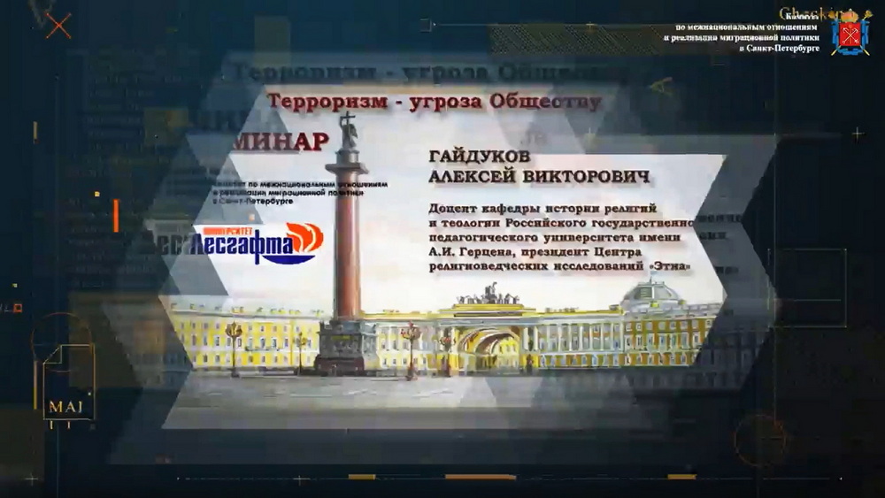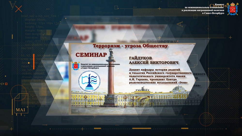 10.06.2022 Семинар «Терроризм – угроза обществу» в ГУМРФ имени адмирала С.О. Макарова [25.05.2022]. 11’36” // Комитет по межнациональным отношениям в СПб : сообщество ВКонтакте. 2022. 10 июня. URL: https://vkvideo.ru/video-104356172_456239144. [5'44"-6'40"].